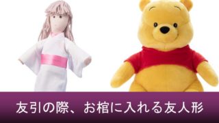 大阪市24区での葬儀実績友引|友人形「くまのプーさんのぬいぐるみ」 友引の葬儀に際に、棺桶にいれる友人形(ぬいぐるみ)についてご紹介するページです。先日、友引での葬儀の際に、友人形(友引人形)の代わりに、故人が大好きだった「くまのプーさんのぬいぐるみ」をお棺に入れてあげたいとご質問をいただきました。友引は友を引くと言う語呂合わせから、お棺の中に身代わりの人形を入れて火葬をおこないます。友人形の代わりにぬいぐるみを入れる方も多くなっております。また故人が好きなキャラクターのぬいぐみであれば、いちばん良いお供人形になるでしょうね。2023.01.03大阪市24区での葬儀実績